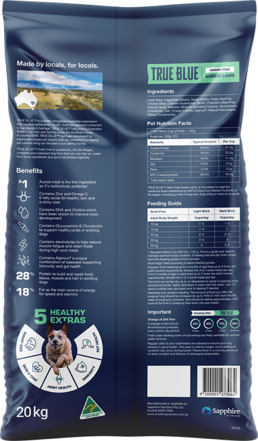 As a dog owner, you want to give your best mate the right nutrition to grow, stay strong, and live a healthy, happy life. That’s why we’ve developed True Blue Grain Free Aussie Lamb — a complete and balanced meal made without grains, gentle on digestion, and packed with added health benefits to support your dog through every stage.